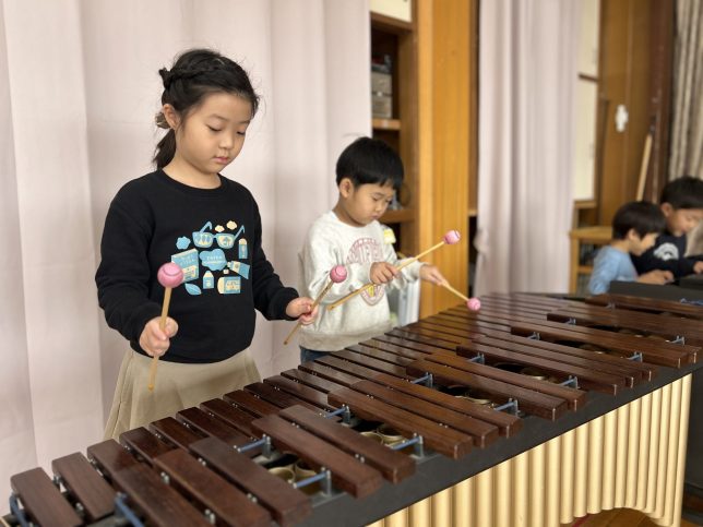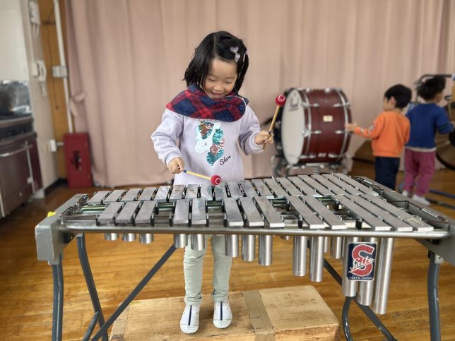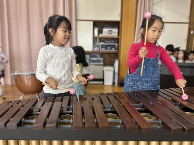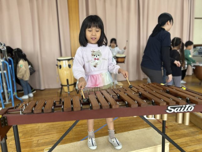 園内には様々な楽器があり、それぞれの特徴や使い方などの指導を受けた後、子ども達は実際にそれらに触れて遊び、自分が合奏の中で演奏したい楽器をじっくり決めていきます。