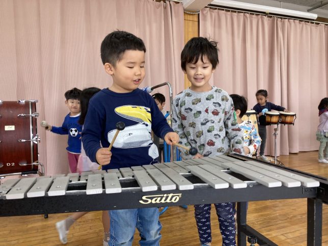 ホームページ内でもご紹介している通り、太陽幼稚園では2月に教育発表会という行事があり、近隣施設の大ホールをお借りし、年長組は器楽合奏を披露しています。