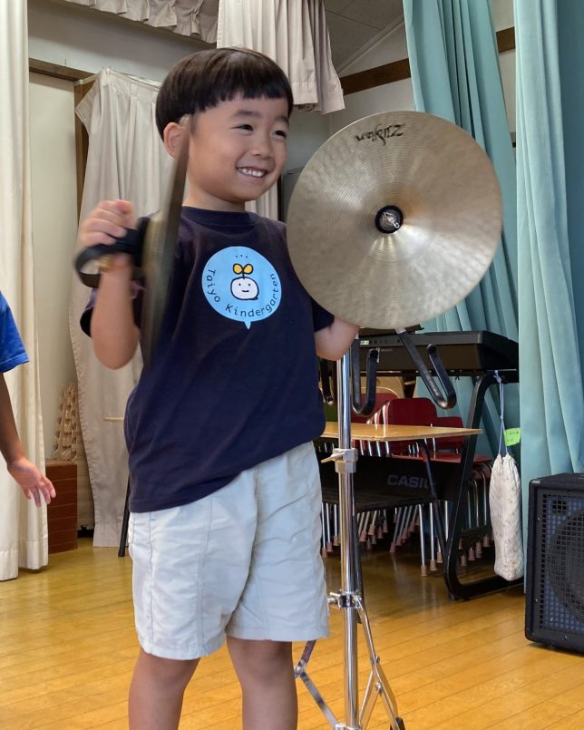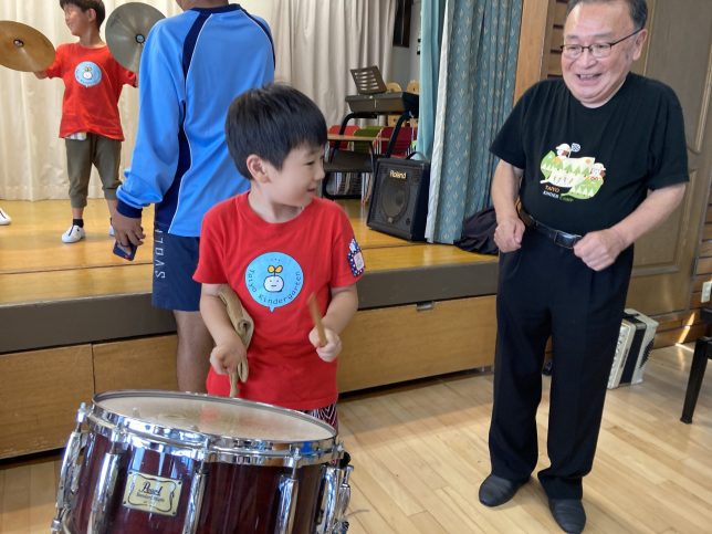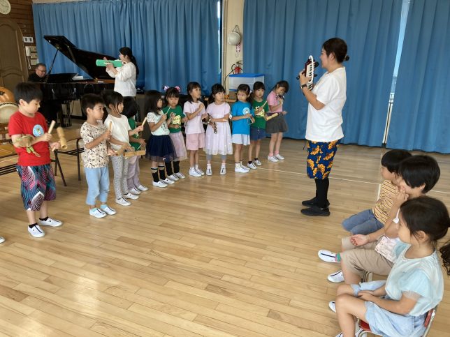 まずは1人ひとりが感じたまま、興味を持った思いを大切にし、音楽監督(ドラちゃんこと)倉橋先生と楽器遊びを楽しみました。